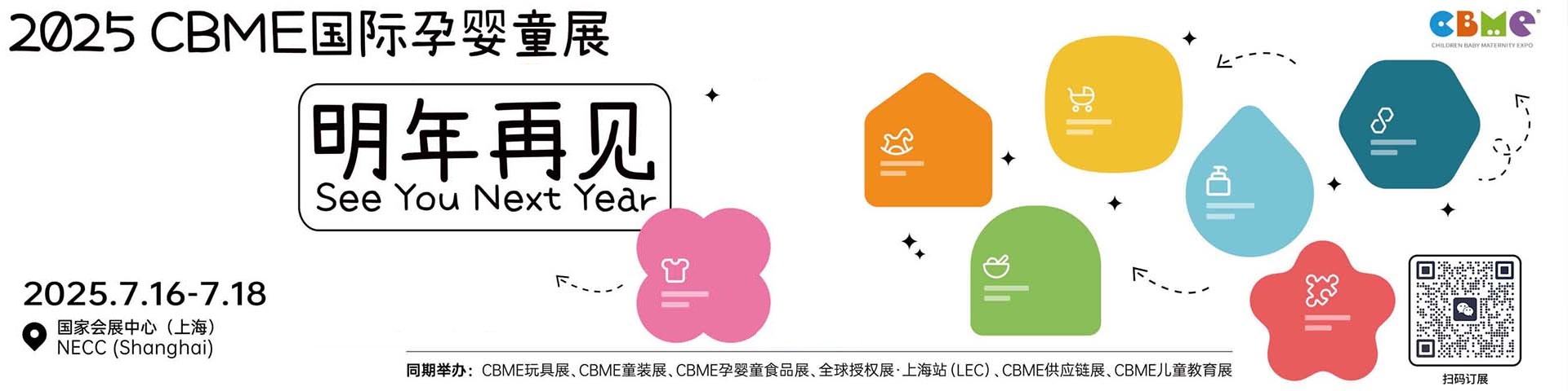 「CBME 国际孕婴童展」(以下简称「CBME」) 始于 2001 年,截至2024年,已成功举办23届 ,第24届CBME国际孕婴童展将于2025年7月16-18日在上海国家会展中心(NECC)举办 ,同期还将举办CBME孕婴童食品展 、CBME童装展、CBME玩具展、CBME供应链展、CBME儿童教育展、上海时尚童装展、全球授权展·上海站(LEC)。CBME 展示范围覆盖孕婴童用品、推车汽座及家具、食品 、玩具、服装、童鞋及配饰、泛母婴综合服务、供应链等全产业链产品及配套服务。CBME 在中国取得巨大成功的同时,已扩展至土耳其、印度等国家,致力于推动和促进全球孕婴童产业的国际交流与贸易合作同期举办CBME玩具展 、CBME童装展、CBME孕婴童食品展、CBME供应链展、CBME儿童教育展···more>>